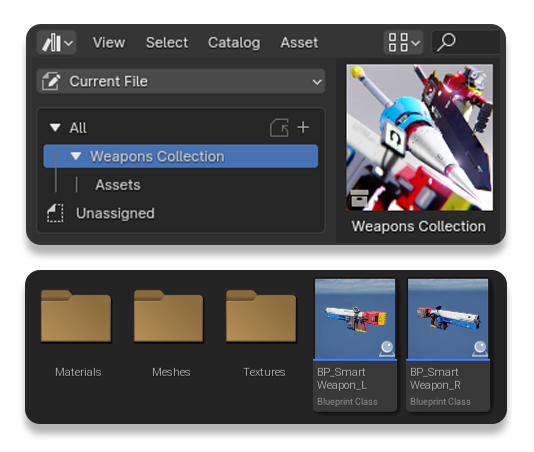 Each asset in Blender is organized in the Asset Browser, allowing you to easily use them via drag-and-drop.