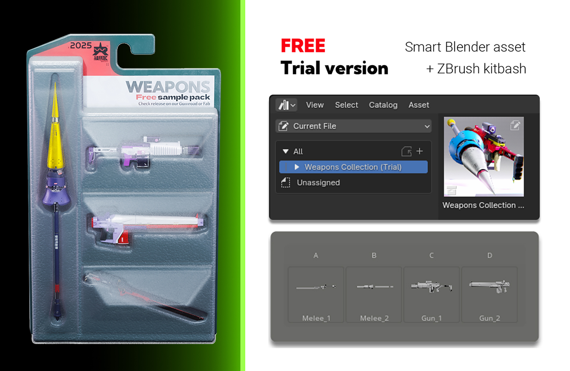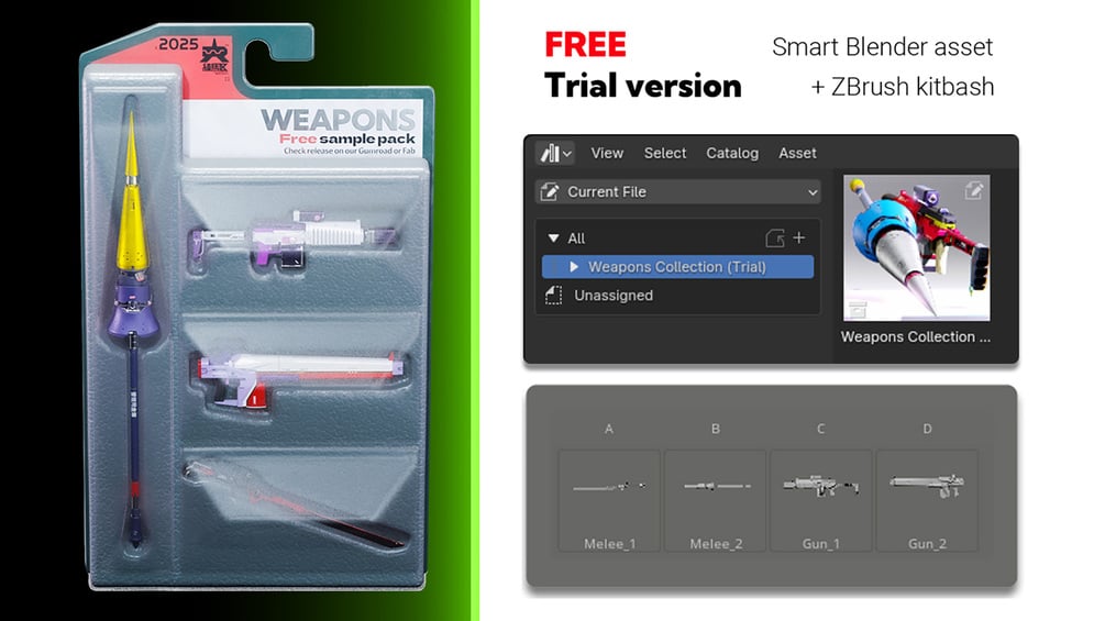 Our system is designed for Blender and Unreal Engine, and we also provide a ready-made kitbash for ZBrush!